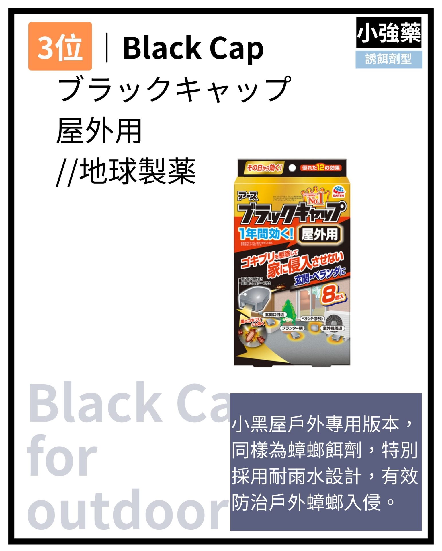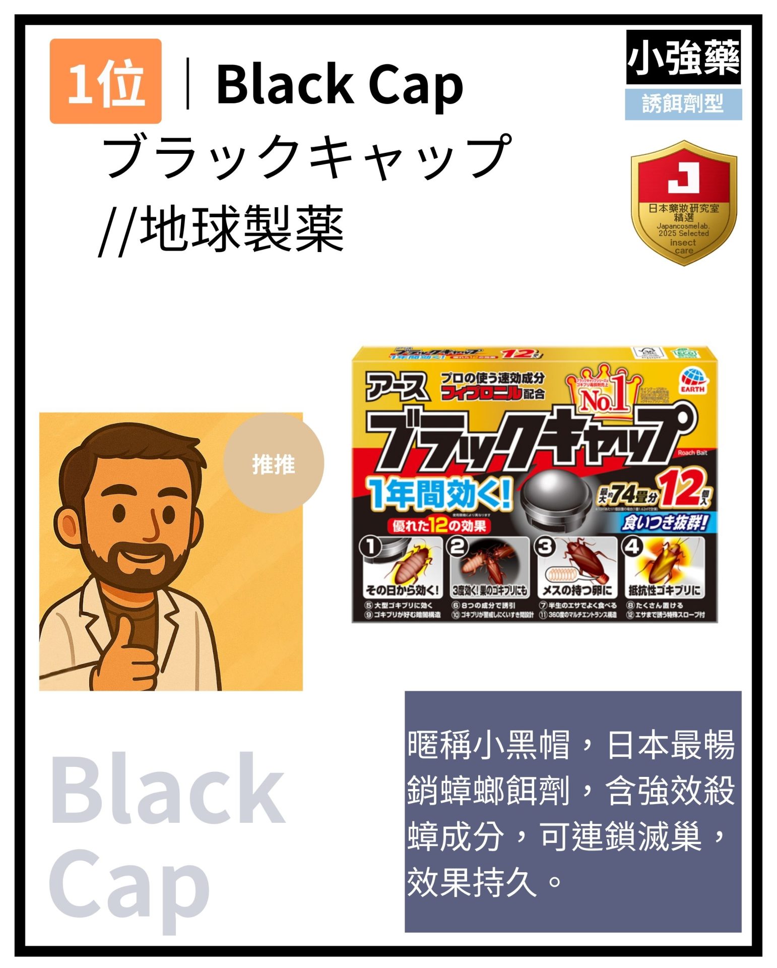 • Feature: 暱稱小黑帽,日本最暢銷蟑螂餌劑,含強效殺蟑成分,可連鎖滅巢,效果持久。